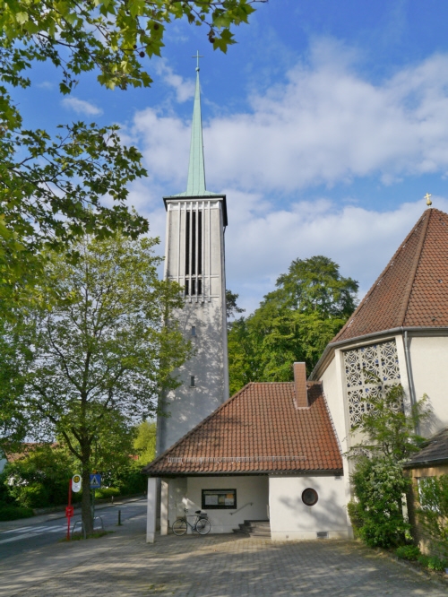 Die Kirche liegt am Fuß des Schinkelberges in einem Stadtteil, der aus Einfamilienhäusern besteht, wovon viele bereits kurz vor dem Krieg gebaut wurden. Ursprünglich waren die großen Grundstücke dazu gedacht, dass sich die Familien mit Gartenerträgen und Kleintierhaltung selbst versorgen konnten.
